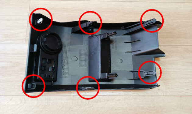 取外したパネルの裏側はこんな感じになっていて、赤い丸で囲んでいる6本の差込み式の爪で固定されています。