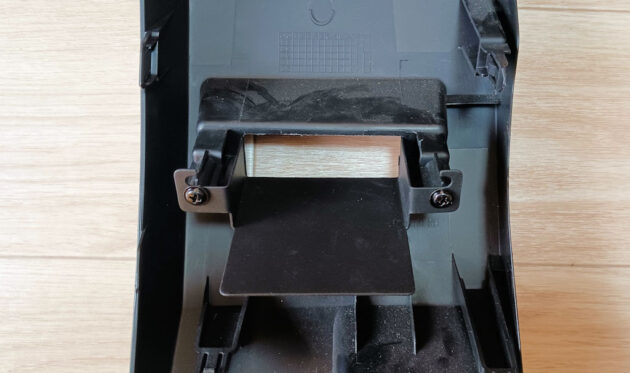 次に取付け用ブラケットを付属のタッピングビスで2ヵ所固定して、ETC車載器本体を両面テープで固定しておきます。